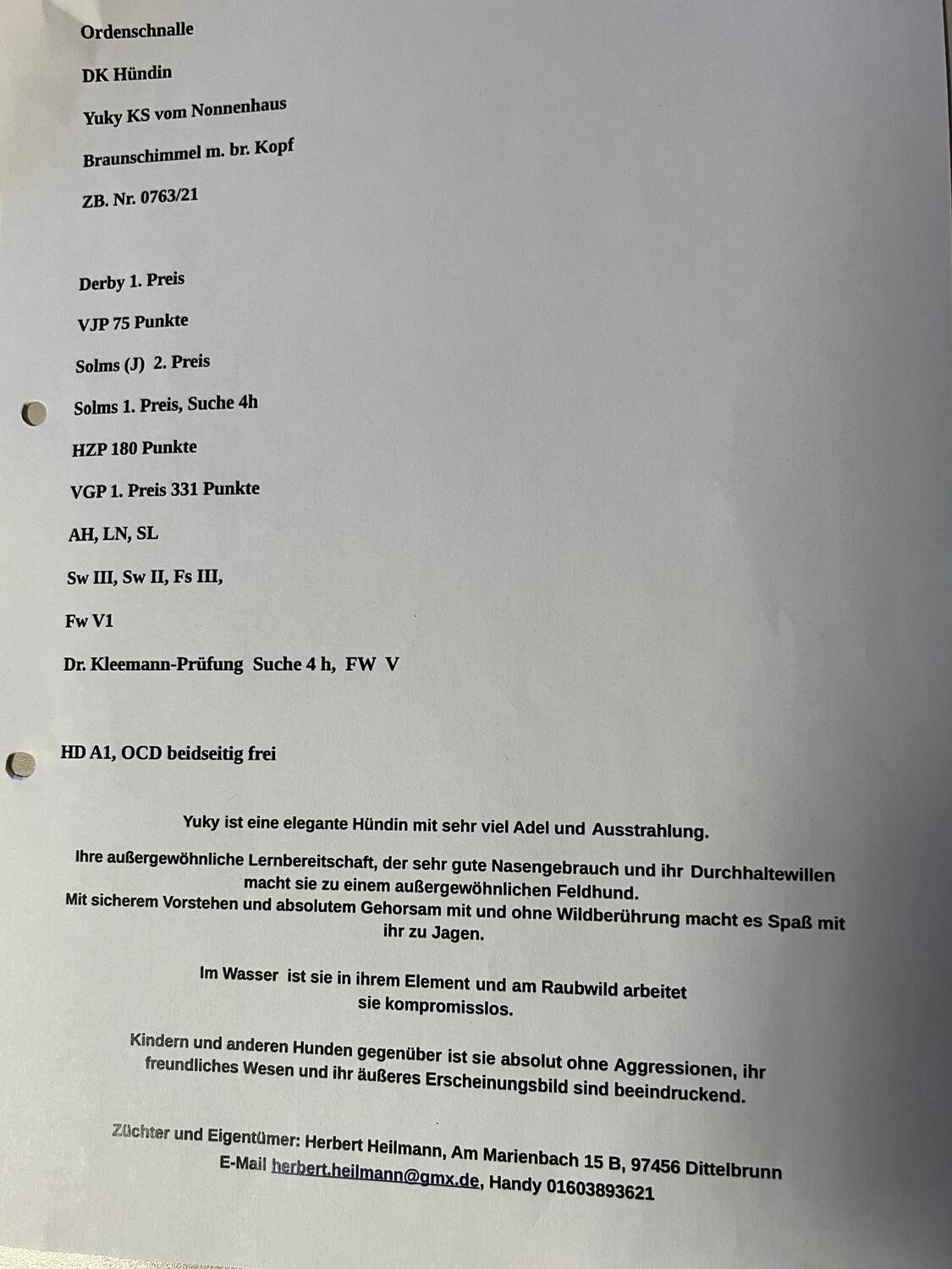 Beide stehen im stetigen jagdlichen Einsatz und sind als nächstmögliche Kleemann-Teilnehmer vorgesehen. Sie sind im Besonderen ruhig und zu Kindern und anderen Hunden unauffällig .
